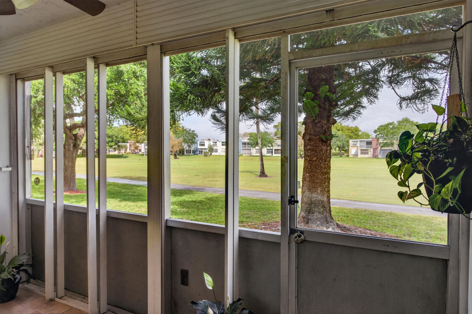 Beautiful FIRST floor unit, soothing colors, bright and airy! Rarely available 1st floor, with large screened in patio overlooking garden and golf course. Lovely and spacious with large windows and lots of storage. Nicely Tiled throughout with a full size washer/dryer. Lots of counter space with the kitchen overlooking the living room. Split bedrooms. Master bedroom has Walk-in closet. Move in ready. Partially furnished. A/C 2017, water heater 2014. Accordion hurricane shutters in all openings for your safety, great place to live, very quite and easy access to all main highways and close to all you need. Beautiful community pool, club house & shuffle board. New baseboards throughout the unit. Good atmosphere within, super clean, Many updates.